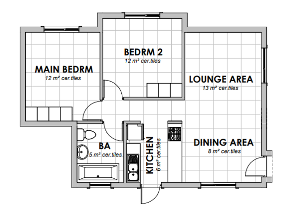 This building plan offers a large 2 bedroomed home with 2 bathrooms, dining room and lounge, kitchen with ample kitchen units, as well as room for your appliances.