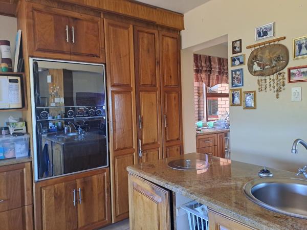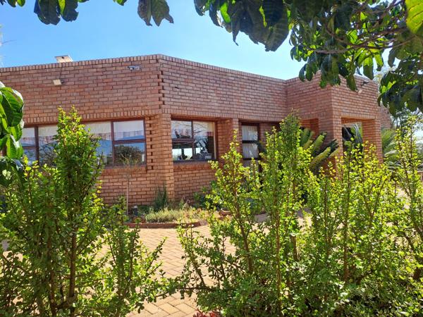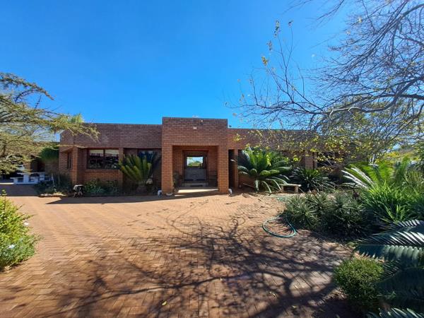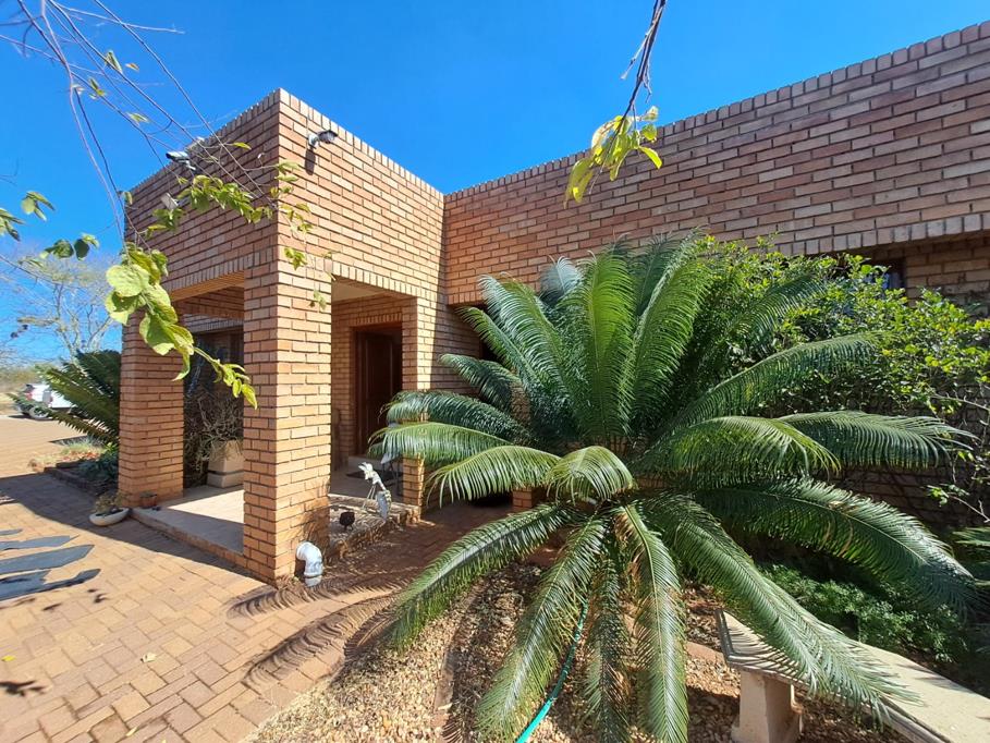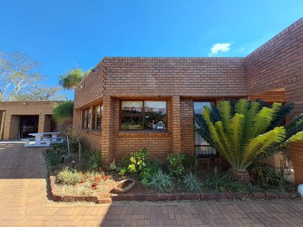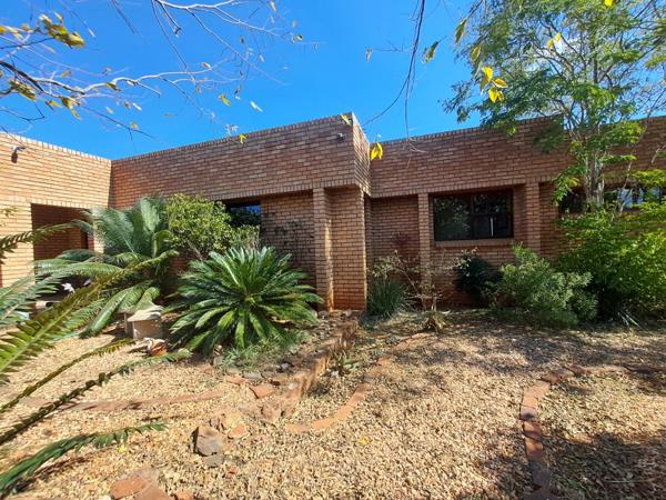 Outdoors, a vast Rhodesian teak-decked patio provides the ideal space for relaxation or entertaining, overlooking a tranquil fish pond, lush garden, and scenic bushveld with views of the koppies. The property also includes a triple garage (one high enough for a caravan), a double carport, paved driveways, a jacuzzi, a room and bathroom for staff, and beautifully landscaped gardens dotted with cycads.
