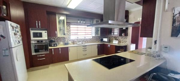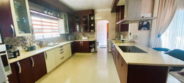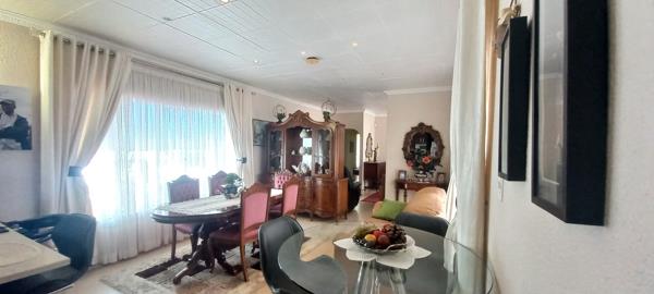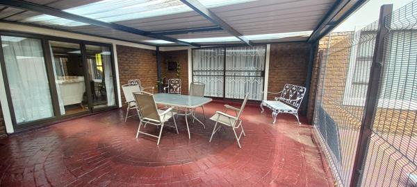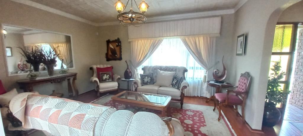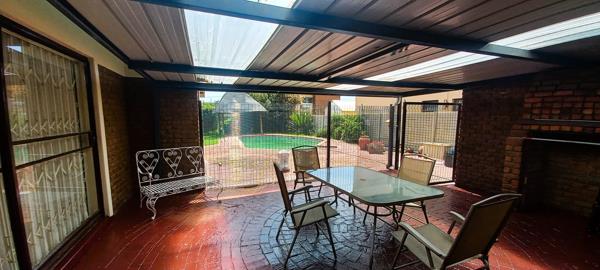 Upon entry, youre welcomed into a bright and inviting reception lounge, featuring large aluminium sliding doors that flood the space with natural light. These doors open onto a covered patio, perfect for effortless indoor-outdoor living and entertaining. From the patio, you can enjoy views of the sparkling swimming pool and lapa area, creating the perfect setting for family gatherings and weekend relaxation.