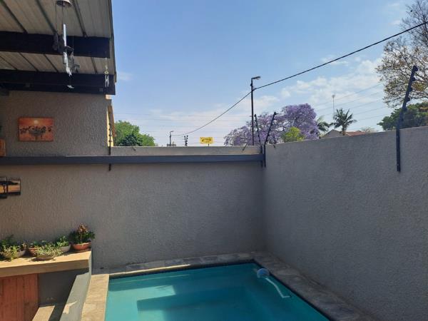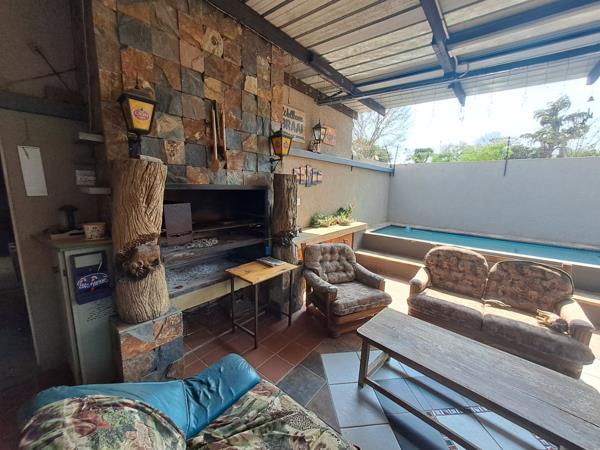 Built-in braai and entertainment area with a small manageable swimming pool, wooden garden shed and steel store room.