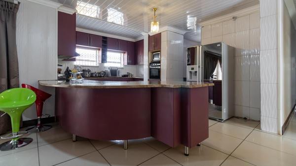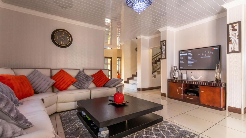It has been finished to the highest quality and presents you with 5 bedrooms, 3 bathrooms - one with a jacuzzi, a guest toilet, 3 lounges, a dining room, a large kitchen with scullerylaundry, and even a gym on the first floor. The property is completed with security, a braai area on the ground floor, a large Wendy''s house outside, a double garage, and additional parking for 4 cars.