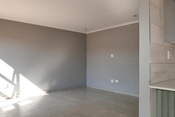 This modern residence boasts an open-plan lounge, dining room, and kitchen with ample cupboard space.