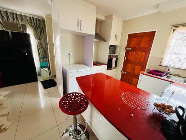 Step into modern comfort with this immaculate 3-bedroom, 2-bathroom home featuring a stylish open-plan lounge and a stunning contemporary kitchen complete with red granite countertops, a touchscreen stovetop, eye-level oven and extractor fan. The main en-suite offers a sleek shower, while the second bathroom includes a bath for added convenience. Outside, the property is fully paved and boasts a double net carport, complete boundary wall, electric fencing and an alarm system for secure living. With a private back gate and neat finishes throughout, this home blends style, security and functionality perfectly.