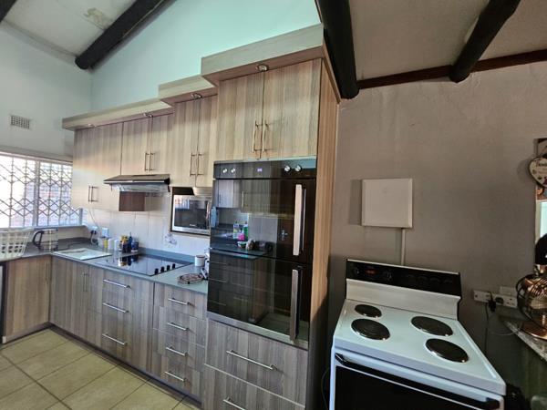 This corner unit has two entrances. Your backyard garden is very well established. Going into your home you have a lovely open plan lounge, dining and kitchen area. Your living room has air-conditioning. Your kitchen is truly a blessing and has recently been renovated. There are all the necessary connections and a pantry. Going out through the back door you have a double garage that is automated. There is also a carport, two water tanks and a storeroom.