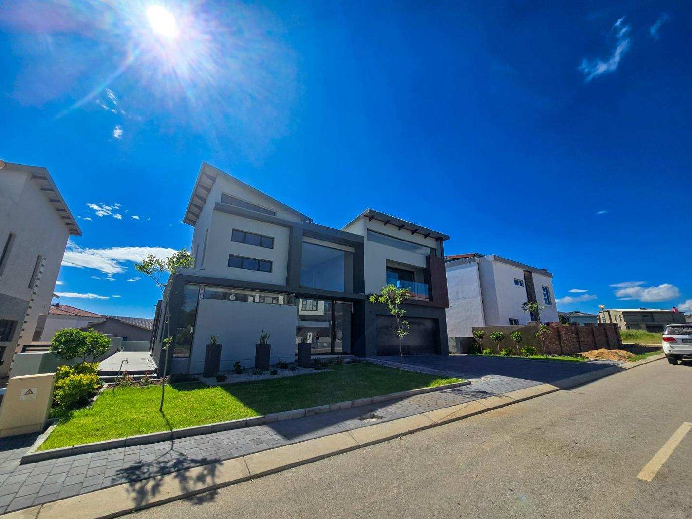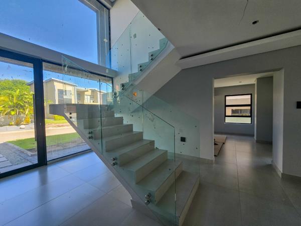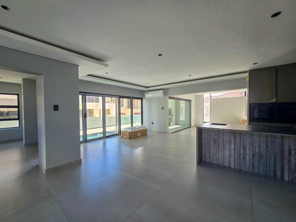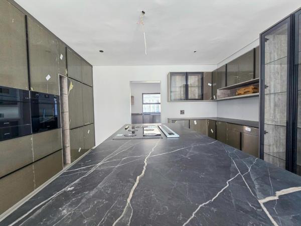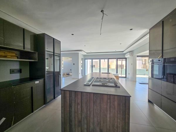 This spacious residence features a modern open-plan design that creates a harmonious flow between the gourmet kitchen, lounge, and dining areas. The heart of the home is undeniably the large kitchen, equipped with a stylish center island, a gas hob, eye-level ovens, and built-in cupboards, providing both functionality and elegance. The tiled floors throughout the living spaces lend an air of sophistication while making maintenance a breeze, allowing you to enjoy both comfort and practicality.
