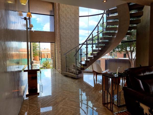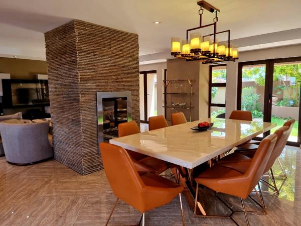 The ground floor features a vast open-plan kitchen, dining area, lounge, and TV room, centered around a stylish fireplace, all thoughtfully crafted for elegance and functionality. A dedicated bar area adds to the allure. The downstairs living spaces seamlessly transition to the outdoors, creating an ideal atmosphere for entertaining and enjoying alfresco gatherings with family and friends, complete with a built-in braai and pool area.
