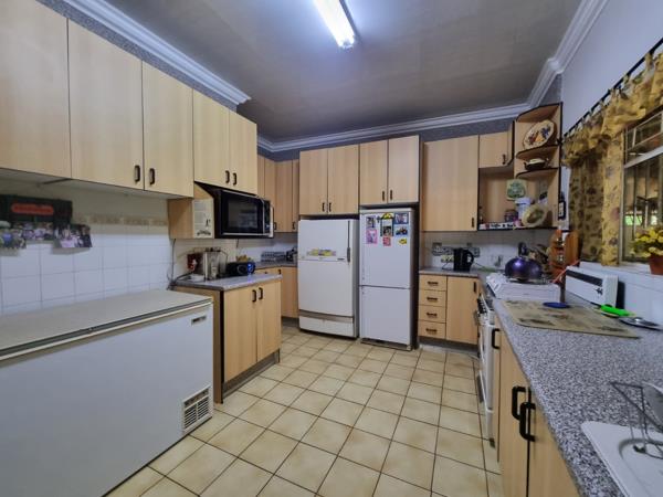 The home features four well-sized bedrooms, all with built-in cupboards, laminated flooring, and ceiling fans. There are three bathrooms, one being the main en-suite, offering both comfort and convenience for a large family. Step outside the kitchen to a fully enclosed patio that has been transformed into a cozy lapa with built-in cupboards and a built-in braai ideal for entertaining guests all year round.