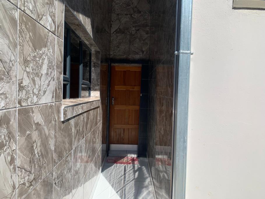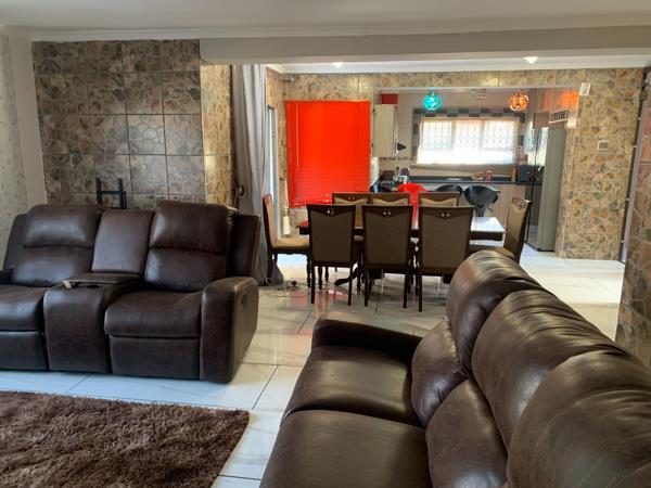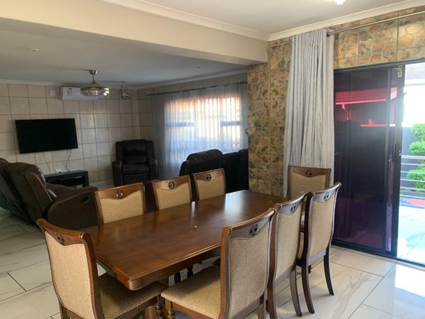 Open plan dining and living area, leading onto a patio with a built-in braai.