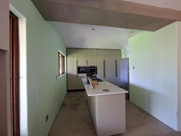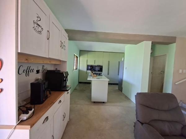 The downstairs area features a spacious open-plan design including a TV room, dining room, and a modern kitchen with a convenient scullery. Wooden doors lead straight out to the private braai area and a low-maintenance garden, ideal for easy outdoor entertaining.