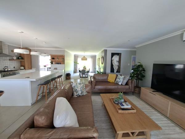 The house is sleek and stylish with an open living room, dining room, and kitchen.