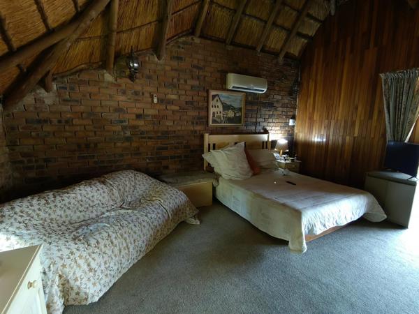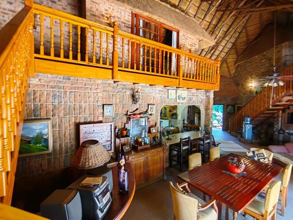 The heart of the home is the open-plan living space, where the kitchen, dining area, and lounge flow seamlessly together. A separate scullery keeps the kitchen neat and functional, while the high thatched ceilings and natural textures create a warm, holiday-like atmosphere year-round.