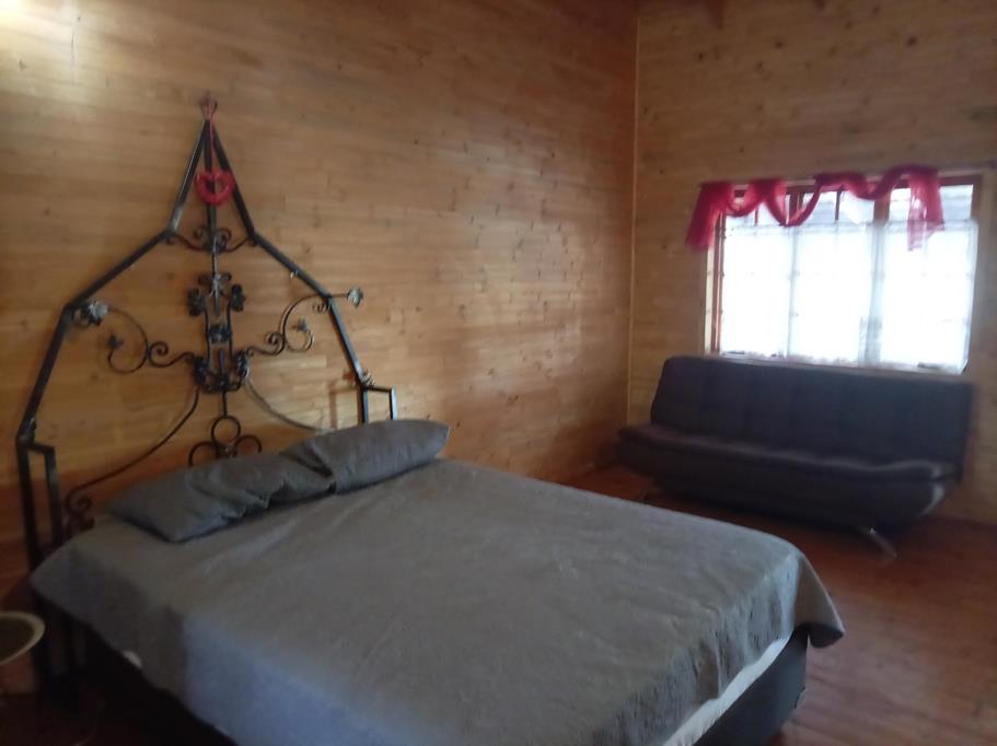 Upstairs: Wooden section with 2 bedrooms, 2 en-suite bathrooms, kitchen, dining area, and lounge