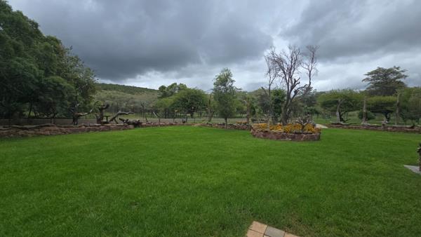 The 4,000 m2 garden is fully electrified, and a comprehensive security system includes alarms inside the house and along the perimeter fencing. Two solar power systems support the property: one powers the house and its borehole pump, while the second system operates the garden irrigation pump, which draws water from a sunk dam.