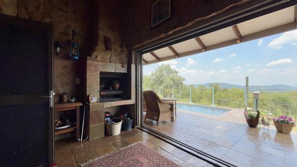 To the rear of the home, expansive views open across the bushveld. A patio with built-in braai overlooks a sparkling swimming pool, complemented by an outdoor shower perfect after warm summer days. A boma and picnic spot are accessed via a beautifully meandering trail, creating an ideal setting for evenings under the stars.