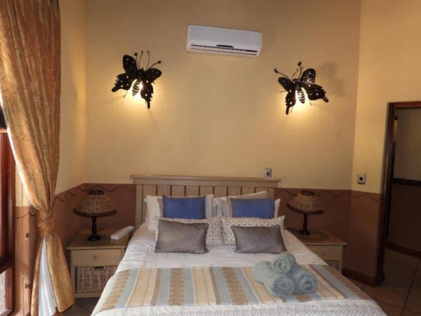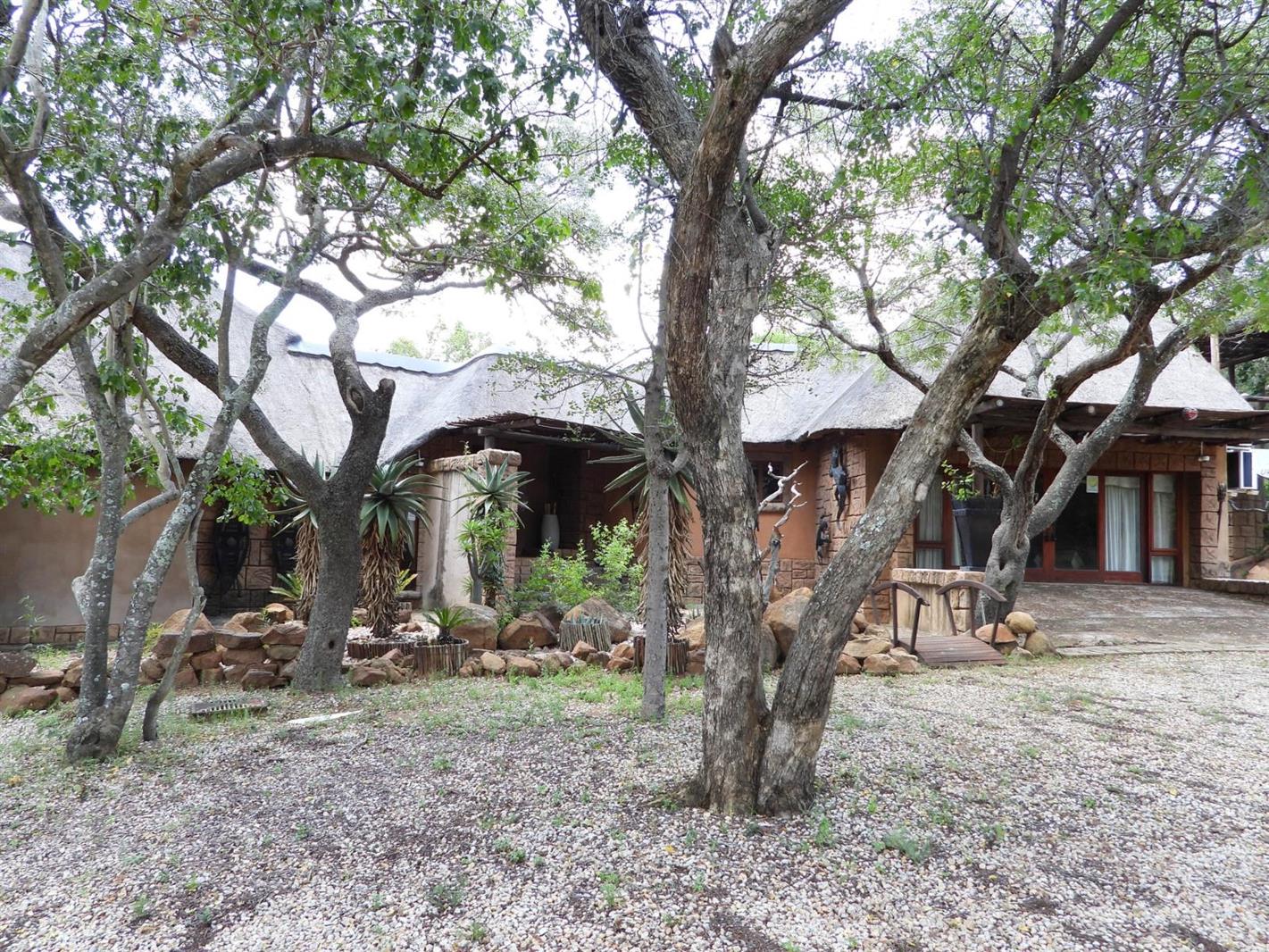 The main house welcomes you with a broad patio that looks out over the bushveld, often visited by wandering nyala and curious warthogs. Large doors open into an airy open-plan living space where the dining room and lounge flow effortlessly together. Sunlight spills across tiled floors, and the hum of air conditioners keeps the home cool even on the warmest summer days. The kitchen forms the heart of the house, fitted with a gas stove for effortless cooking, an electric oven, a generous pantry, and a separate scullery that keeps everything neat and practical when entertaining guests.