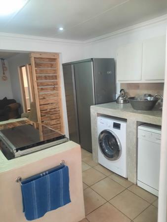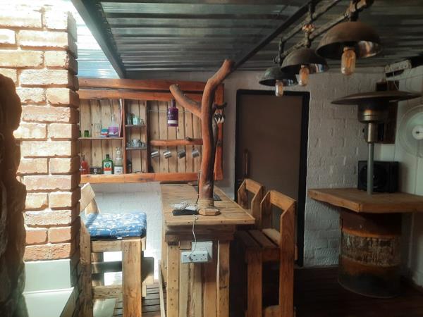 The second unit offers a more spacious layout and includes its own entrance. The kitchen is fitted with cupboards and a gas stove, flowing into a lounge area with a fireplace. An entertainment area with a built-in braai creates the perfect space for relaxing and hosting guests. Two smaller bedrooms and a bathroom with a shower complete this section, while a private courtyard adds to the outdoor living appeal.
