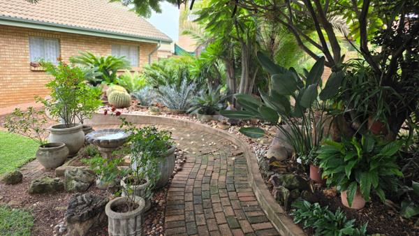The garden is beautifully maintained and adds a tranquil touch to the property, featuring established cycads that enhance the outdoor setting.