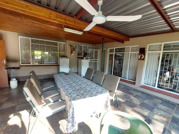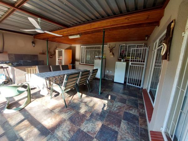 Outside amenities such as the circular outside braaiboma, garage, carports, outside toilet, zinc storerooms, borehole with a pressure pump, Jo Jo water tank demonstrate a thoughtful design for practicality and sustainability. Overall, this is a well-equipped and comfortable home for a family.