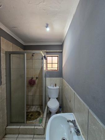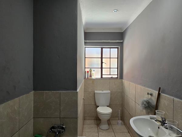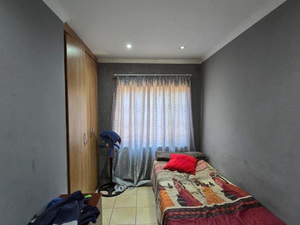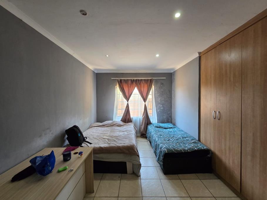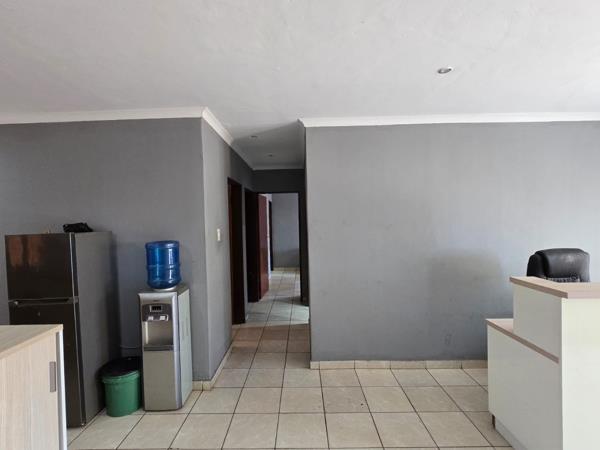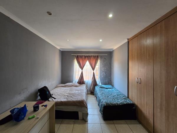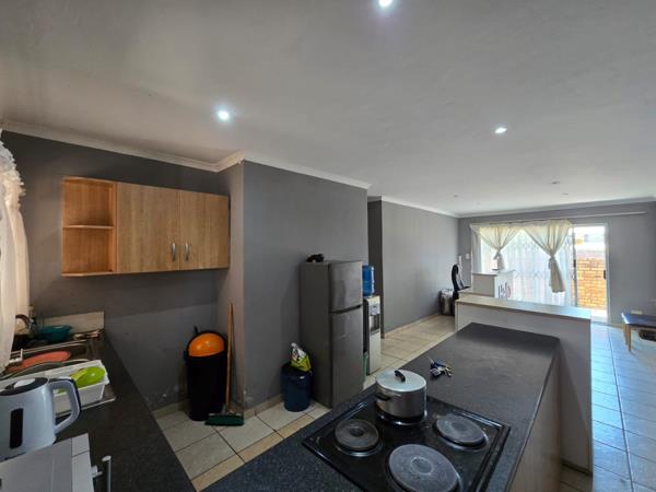 This residential property in Onverwacht, Lephalale, offers a practical living solution within a suburban complex. The interior features an open-plan kitchen and lounge area, complete with tiled flooring and built-in kitchen cabinets, ideal for modern living. Natural light fills the space, enhanced by recessed ceiling lights and sliding doors.