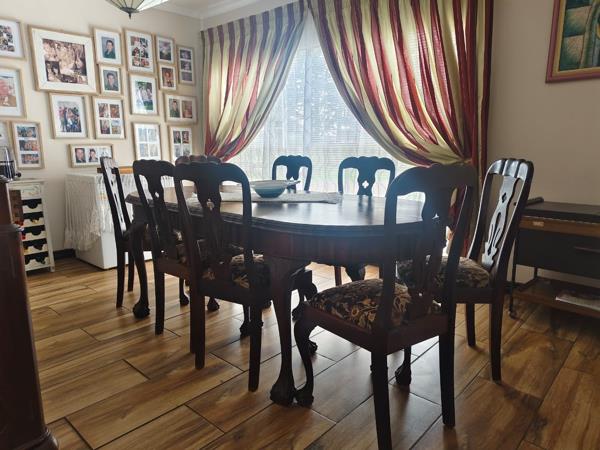 Security is a priority, with features such as an alarm system, burglar bars, and a electric gate providing peace of mind. For sustainable living, the home is equipped with a solar geyser and water tanks and fully installed solar system. Parking is well-catered for with two garages. Sliding doors offer seamless access to the outdoor spaces.