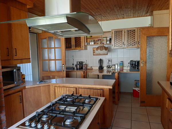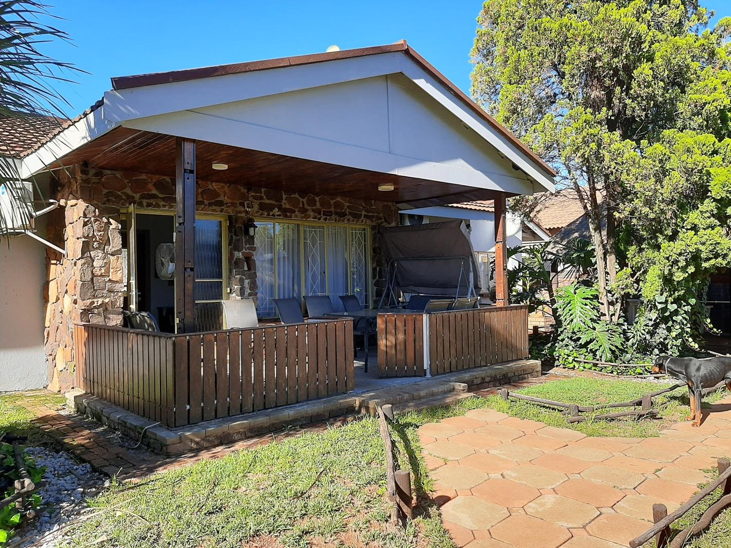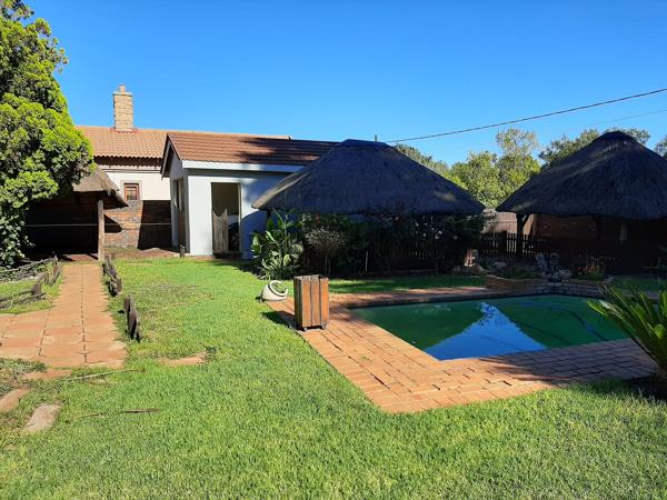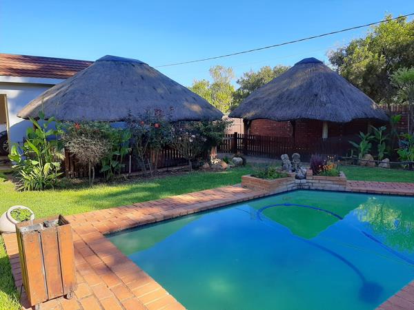 The main house has a patio, 2 living areas, an open-plan dining room, a classic big kitchen, laundry, three bedrooms, of which two have built-in cupboards, and two bathrooms, one of which is on-suite. Solar geyser