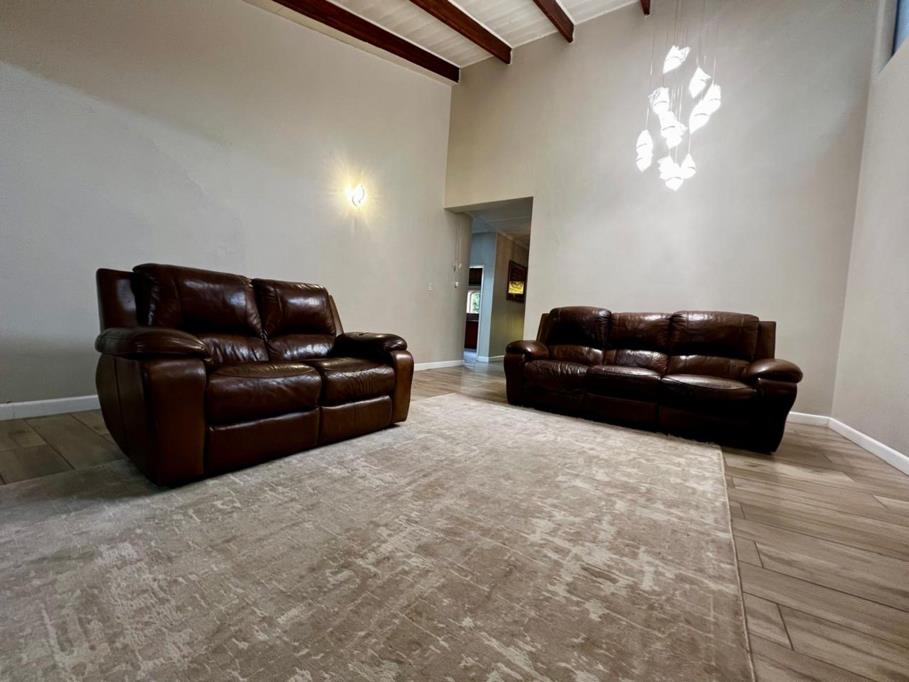 Generous living areas include two interleading lounges with high ceilings and a welcoming fireplace, plus a dining space flowing to an indoor braai room and enclosed patio ideal for relaxed entertaining.