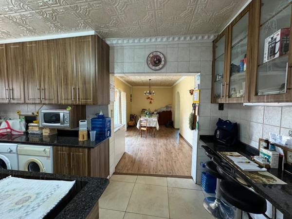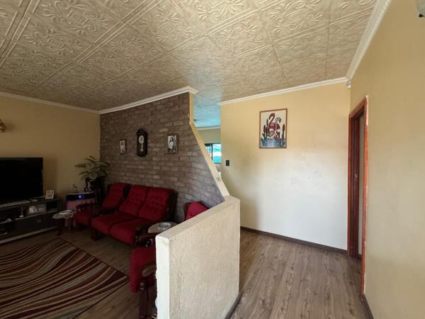 A cozy yet spacious living area also features laminated flooring, providing a warm and inviting space for relaxation. The house comprises four generously sized bedrooms, all fitted with built-in cupboards and laminated flooring. The master bedroom includes an ensuite bathroom for added privacy, while a second bathroom serves the other bedrooms.