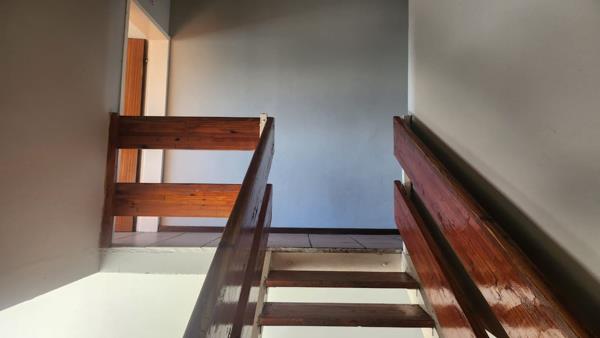 Upstairs offers two bedrooms, a full bathroom with bath, basin, and toilet, plus built-in cupboards in the passage for extra storage.