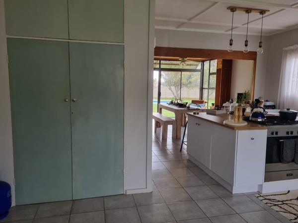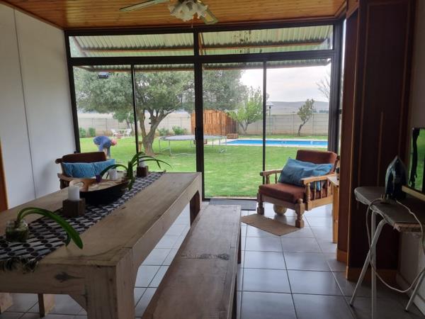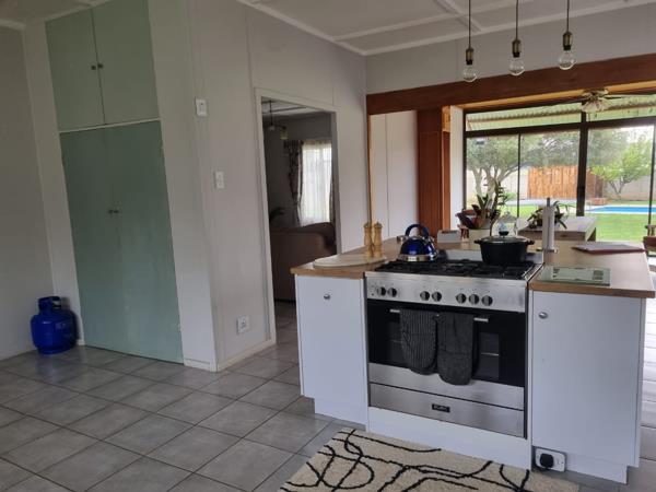 Step outside to indulge in the beauty of your surroundings. A sparkling pool and expansive entertainment area provide the ultimate setting for family gatherings or tranquil evenings under the stars. Inside, the home boasts four generously sized bedrooms, each with built-in cupboards for ample storage and comfort. The luxurious bathroom is a haven of relaxation, complete with elegant finishes, a shower, and a bath to cater to all your needs. Tiled floors throughout the home ensure easy maintenance, while additional features like a laundry room and an outer building enhance its practicality and appeal.