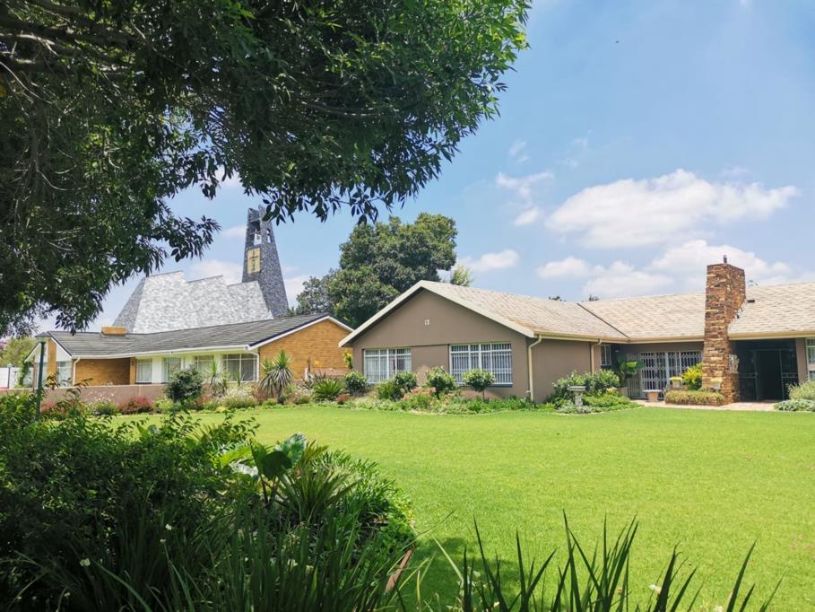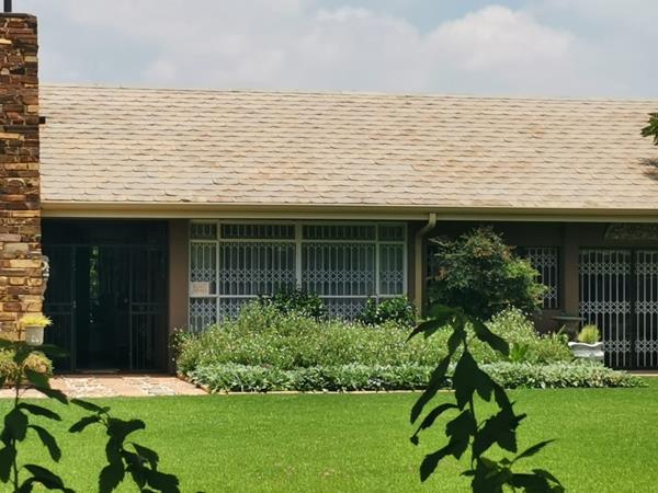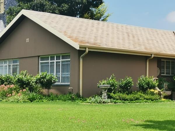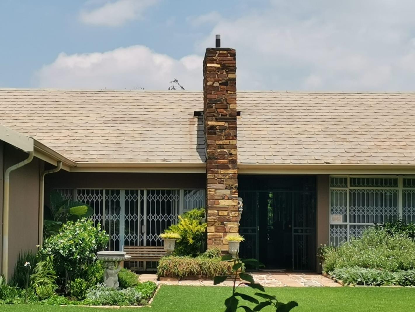 Spanning a generous 2973 sqm erf, the property boasts extensive, manicured lawns, mature trees, and a distinctive scalloped tile roof with a charming brick chimney.