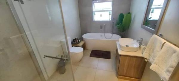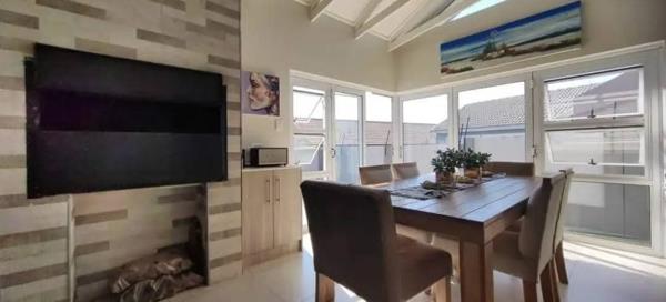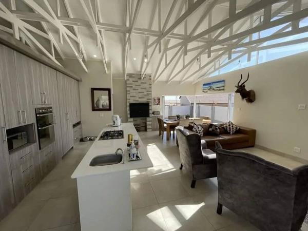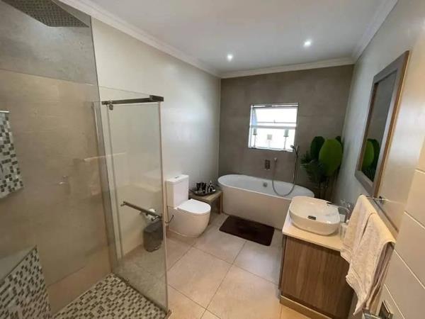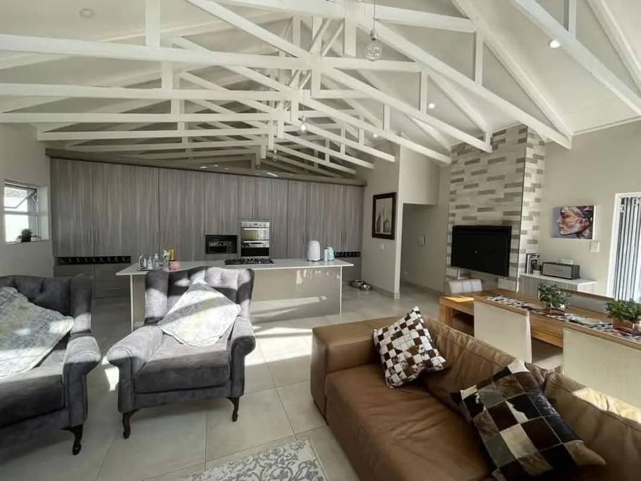 This ultra modern 3 bedroom home is Immaculate and boasts two stunning bathrooms, a beautiful open plan kitchen with a centre Island and a gas stove. It has a large open plan living area with high volume ceilings exposed beams and a built in braai with stack away doors that open to a private pet friendly yard. There is also a double garages, Electric fencing, alarm system and CCTV System. This home is also fitted with a gas geyser and an inverter system so the lights stay on during load shedding. Electricity is prepaid.