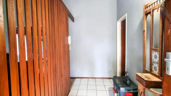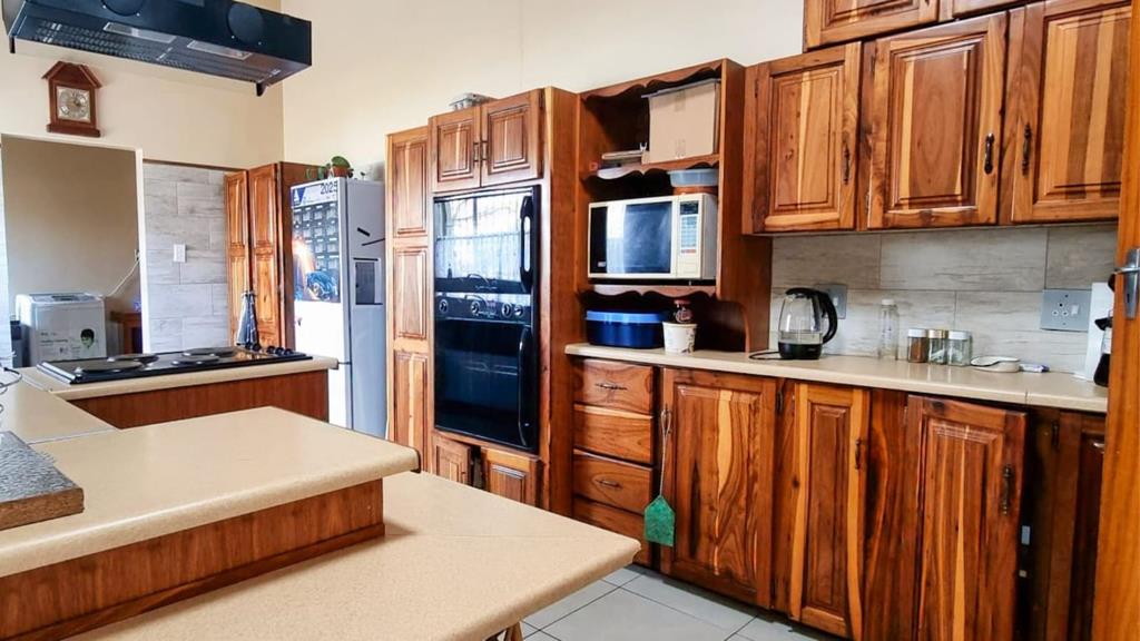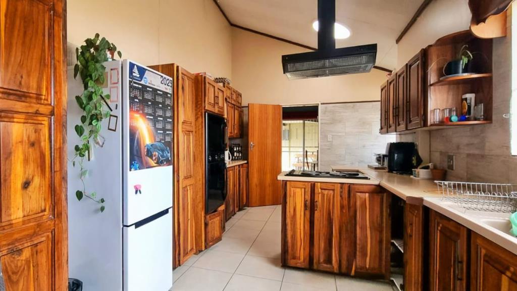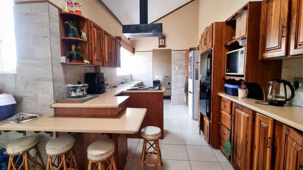 The main house features three well-sized bedrooms and two bathrooms. The kitchen is fitted with ample built-in cupboards, an electric stove, extractor fan, eye-level oven, and a separate scullery perfect for functional everyday use. The dining area opens up to a spacious lounge and an undercover entertainment area, ideal for hosting guests or relaxing with family.