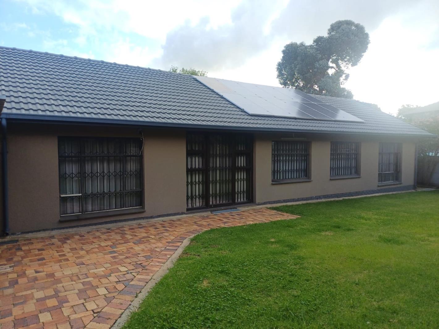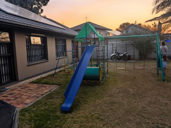 The outdoor spaces are designed for convenience and family enjoyment, featuring a garden, paved areas, and a patio. Practical additions include a Wendy house and a children''s playground. For vehicle accommodation, there are three garages and two additional parking spaces. The property is equipped with solar panels and a battery inverter for enhanced energy efficiency, alongside a water tank for potential water conservation. Security is addressed with burglar bars and a totally walled perimeter.