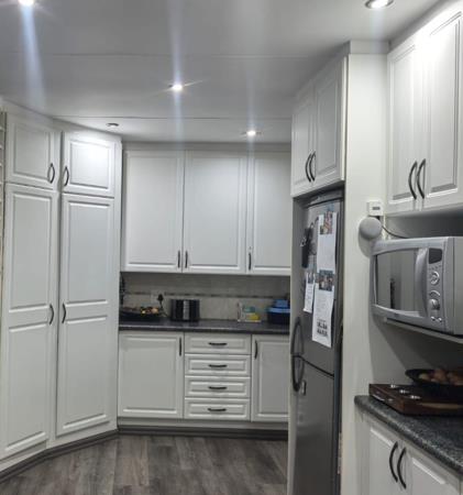 Inside, the home features two distinct lounges, a dedicated dining room, and an additional familyTV room, providing ample space for relaxation and gatherings. The modern kitchen boasts white cabinetry, dark countertops, and wood-look laminate flooring, ensuring a functional and stylish culinary environment. An open-plan layout enhances the flow between living areas, creating an expansive feel.