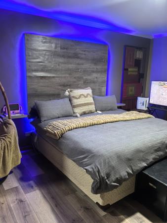 Entertainment is a highlight, with dedicated spaces including a built-in bar and an area perfect for a pool table, ideal for hosting friends and family. The five bedrooms offer generous accommodation, with one featuring a modern aesthetic, complete with a large wooden headboard and integrated blue LED backlighting, complemented by dark wood-style flooring. The home includes an ensuite bathroom and a convenient guest toilet.