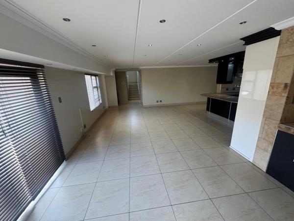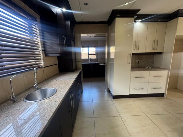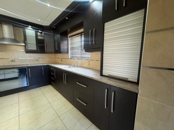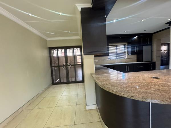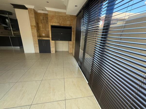 Step inside to an inviting open-plan living area, characterized by light-coloured tiled flooring and recessed lighting, creating a bright and airy atmosphere. Large windows fitted with blinds allow for ample natural light. The contemporary kitchen is a highlight, featuring stylish dark cabinetry, granite countertops, and a practical breakfast bar, complete with a built-in oven, hob, and extractor fan. The seamless flow extends to a dedicated braai room, perfect for entertaining guests.