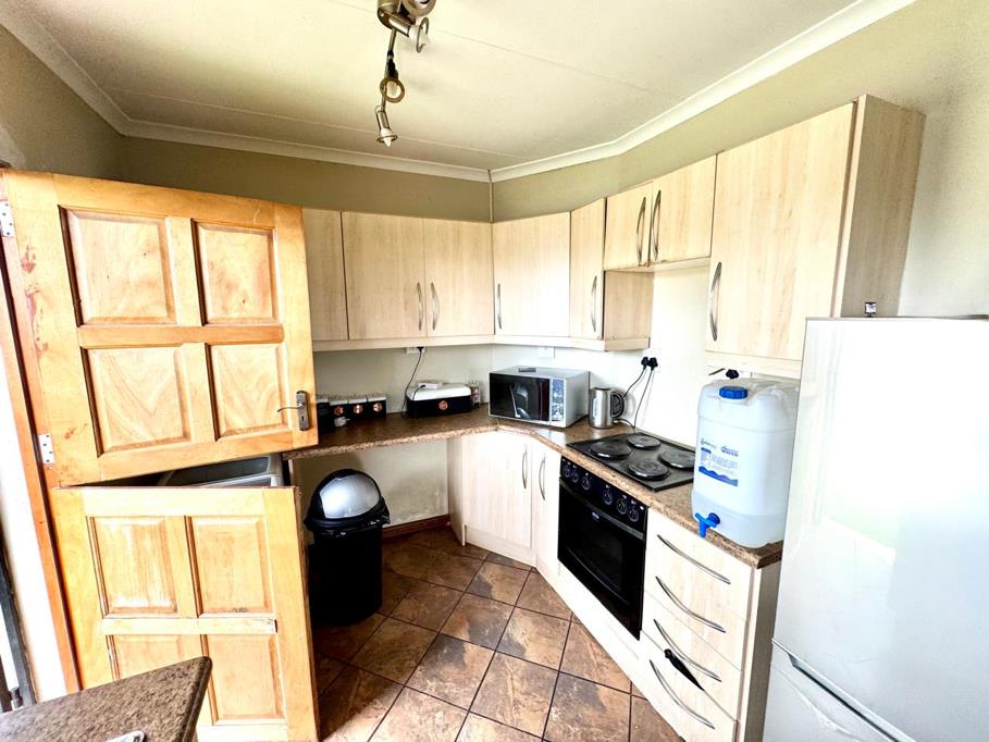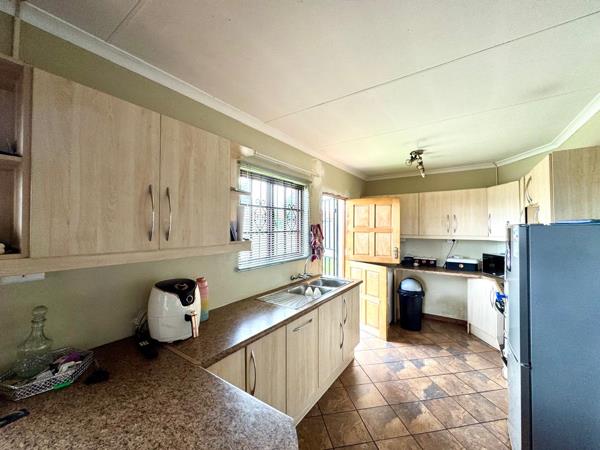Inside, the home opens into a welcoming living area that serves as the heart of the house. This space is well proportioned and versatile, allowing for both lounge and dining arrangements, and it connects smoothly to the kitchen for easy everyday living. The kitchen is functional and neatly finished, featuring ample built in cupboards, durable countertops, and space for essential appliances. Its practical layout ensures efficient movement and convenience for daily cooking needs.