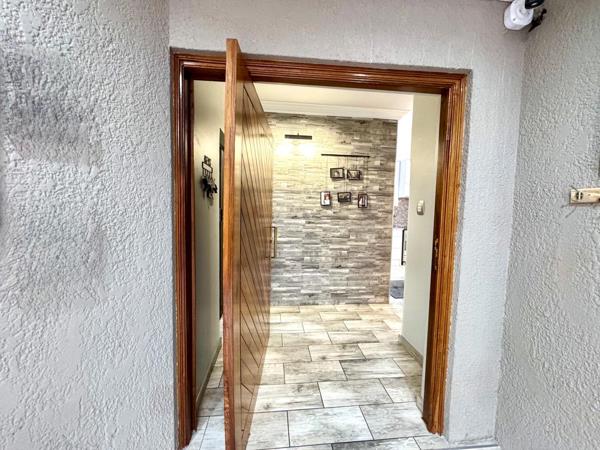 Upon entering, you are welcomed into a fully tiled indoor entertainment and braai area, complete with a built-in braai and skylight that allows for abundant natural light. This inviting space sets the tone for the rest of the home. The main living area boasts raised ceilings with exposed wooden beams, a cozy fireplace, and solid wooden doors that open directly onto the front garage, enhancing both functionality and character.