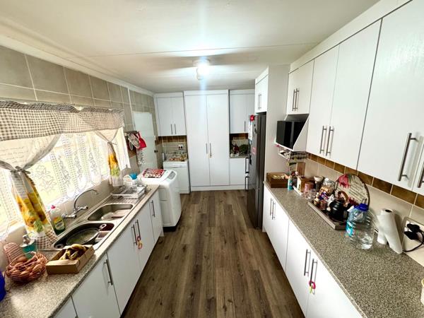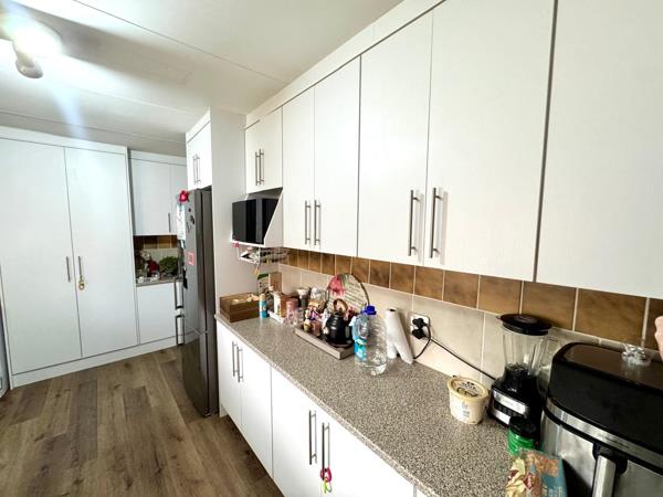 The kitchen is neat and functional, fitted with white melamine built-in cupboards and ample counter space to accommodate daily cooking needs. It is equipped with a four-plate electric stove and oven and includes connection points for all major appliances, ensuring convenience and ease of use.