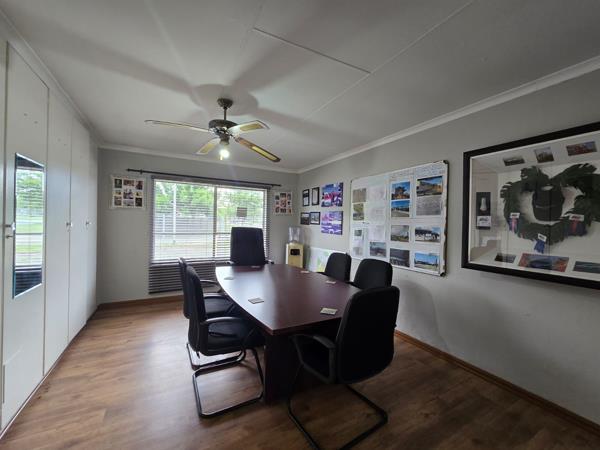 The interior welcomes clients with an inviting reception area, complemented by a boardroom and two well-appointed offices. The reception area, offices, boardroom, and passage are finished with stunning laminated floors, creating a modern and professional atmosphere throughout.