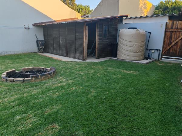 Outside, the property continues to impress with a single garage fitted with an electric roll-up door, as well as a carport with a fibreglass roof. The garden is in excellent condition with ample space, including a charming boma area for entertaining. Extras include a Wendy house, an outside room ideal for storage, and the home is pet-friendly.