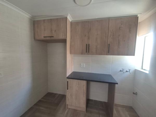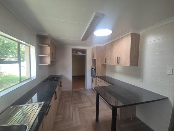 Inside youll find a spacious open-plan living and dining area with warm laminated flooring and beautiful knotty pine ceilings. The kitchen is completely brand new with modern cupboards, granite tops, and fresh tiling, plus a separate laundry area.