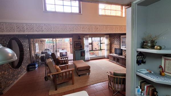 Lounge with high-up ceiling and loft windows for maximum sunlight and fire place exits on to the covered stoep for outside air