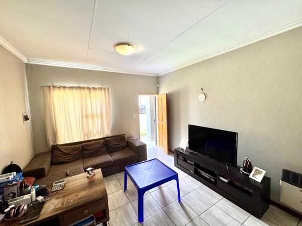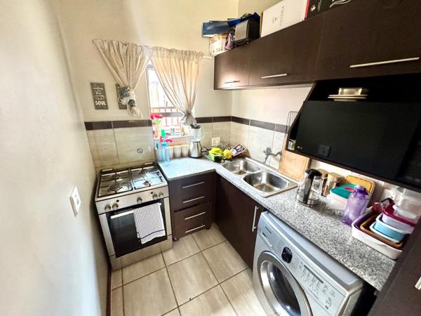 Inside, the open-plan living area creates a warm and practical space, seamlessly connecting the lounge and kitchen. The tiled floors enhance durability and easy maintenance, while neutral wall tones allow for versatile decor. The kitchen is functional and compact, offering ample cupboard space and room for essential appliances, making it ideal for everyday living.
