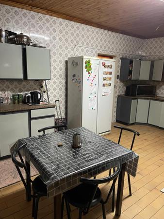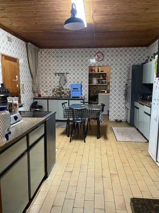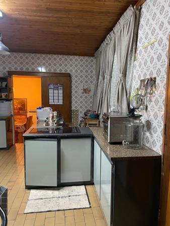 The heart of this home is its large kitchen, characterized by a warm wooden ceiling and durable tiled finishes. It provides abundant cabinetry, extensive counter space, and a dedicated dining area, making it ideal for family meals and gatherings. A built-in oven and a separate utility area with laundry facilities enhance functionality, presenting a practical layout with potential for modern enhancements to suit contemporary tastes.