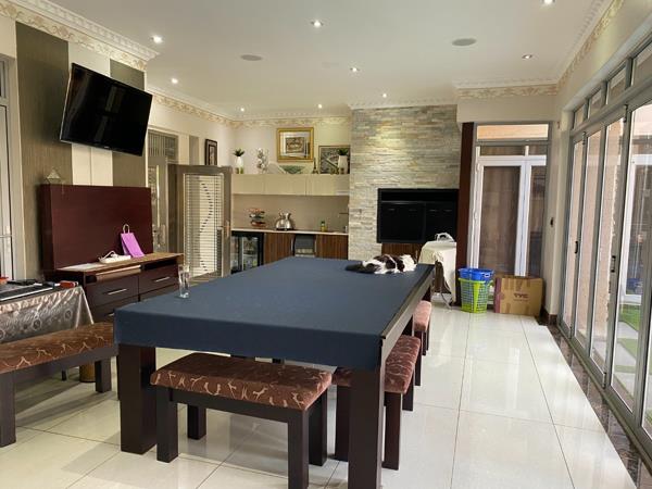 An Entertainment Area with Pool table, Leading out to an Amazing Pool with Fountain,