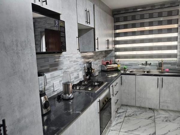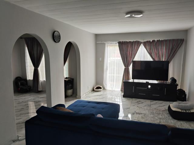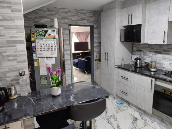 This elegant home offers three well-appointed bedrooms with built-in cupboards, two modern bathrooms, and a sophisticated open-plan living area seamlessly flowing into a contemporary kitchen, ideal for both everyday living and entertaining.