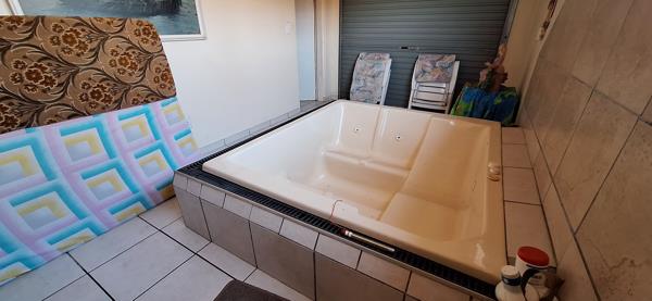 A spacious jacuzzi room downstairs with a view of your front yard.