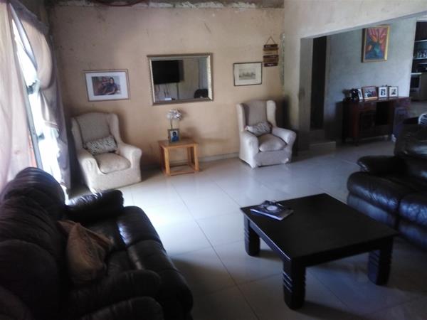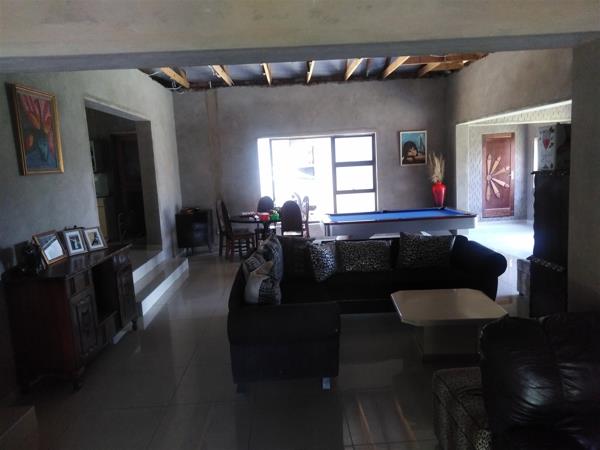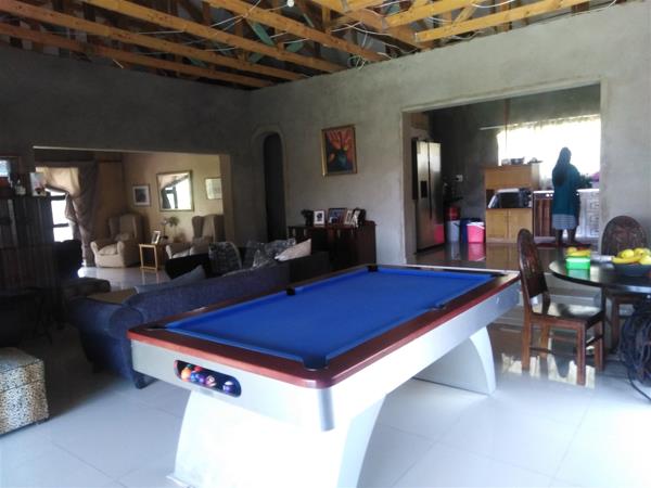 This is a dream come true if you are a renovator. New section of the house must still be finished. 5 Bedroom house with 3 bathrooms. Open plan lounge, tv room, dining room with built in braai. Games room and Patio. Solar system and borehole. Uncapped wi-fi.