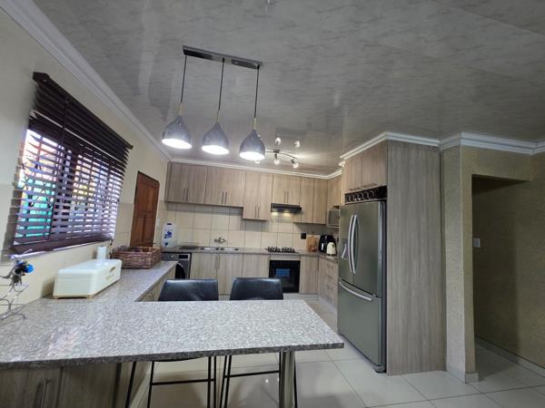 Inside, the home continues to impress with modern finishes throughout. A stylish built-in TV unit creates a chic focal point in the living area, while the open-plan kitchen is a chefs dream boasting granite countertops, ample cupboard space, and a gas hob for efficient cooking. The entire home is tiled with modern flooring, offering a clean and cohesive aesthetic.